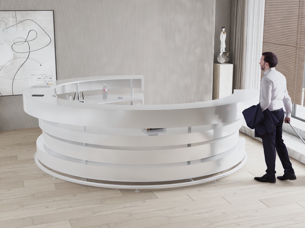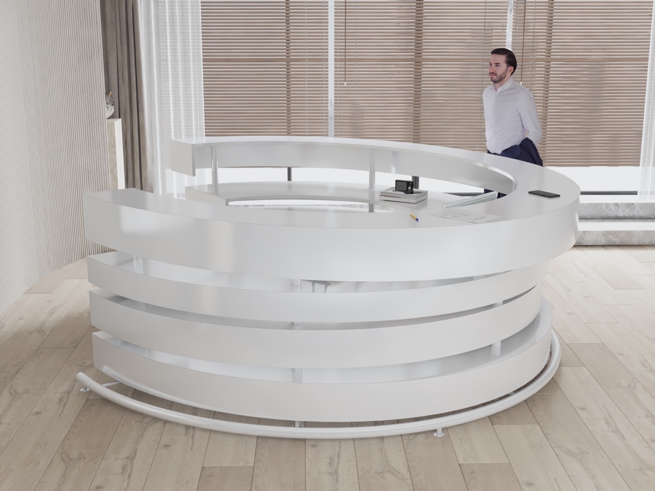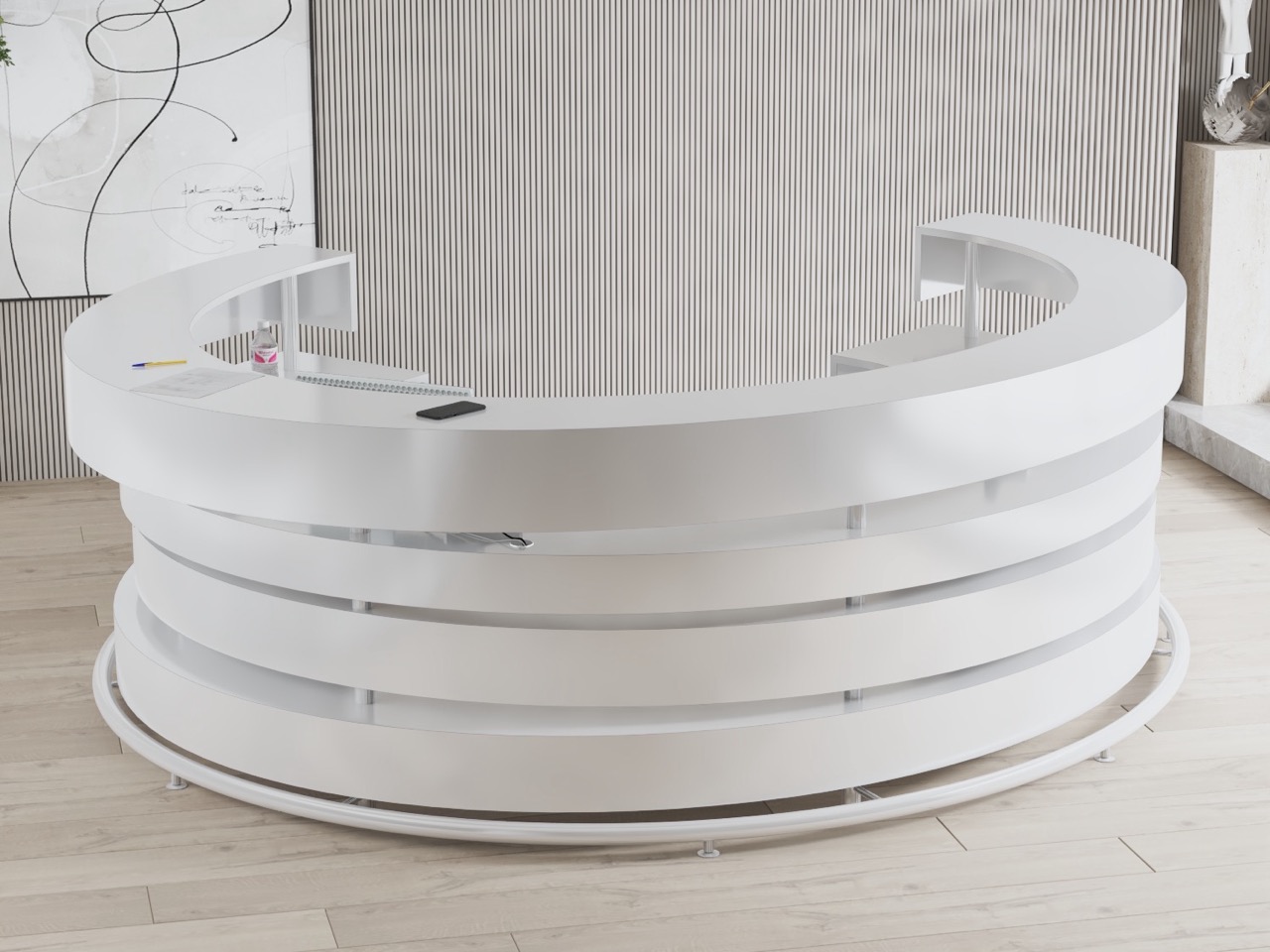 Der Empfangstresen R246 ist ein Entwurf für großzügige Räume, in denen der Tresen nicht nur ein Blickfang, sondern auch ein wichtiges architektonisches Element ist. Die schöne kreisförmige Silhouette aus geschichteten und lichtdurchlässigen Kreisen macht sich gut in Lobbys von Bürogebäuden, großzügigen Eingangsbereichen oder kulturellen Einrichtungen.