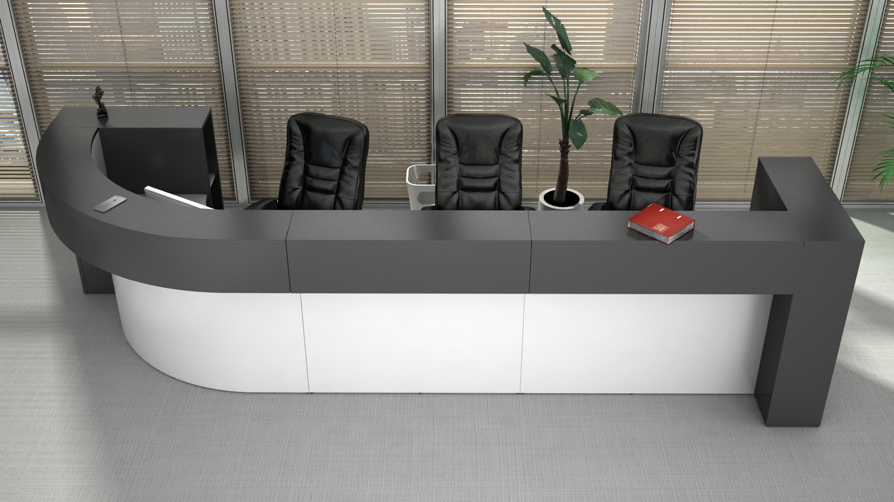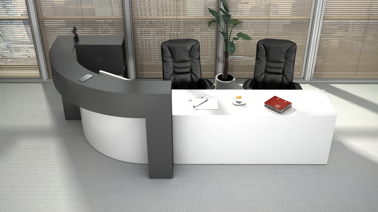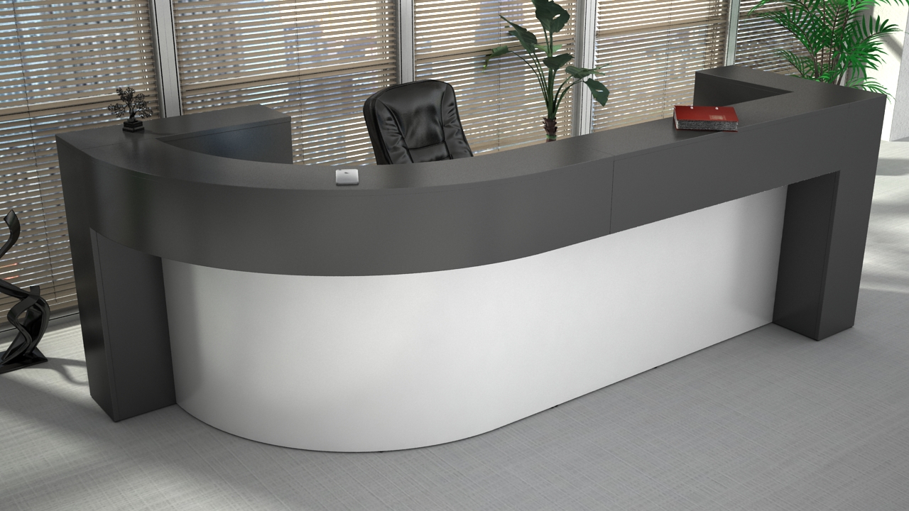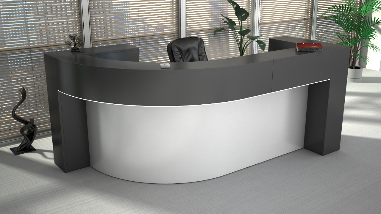 Im Rahmen von PRESTIGE kann der Schreibtisch aus einer glänzenden Platte bestehen und mit einem hinterleuchteten Logo oder Schriftzug hinter Glas versehen werden.