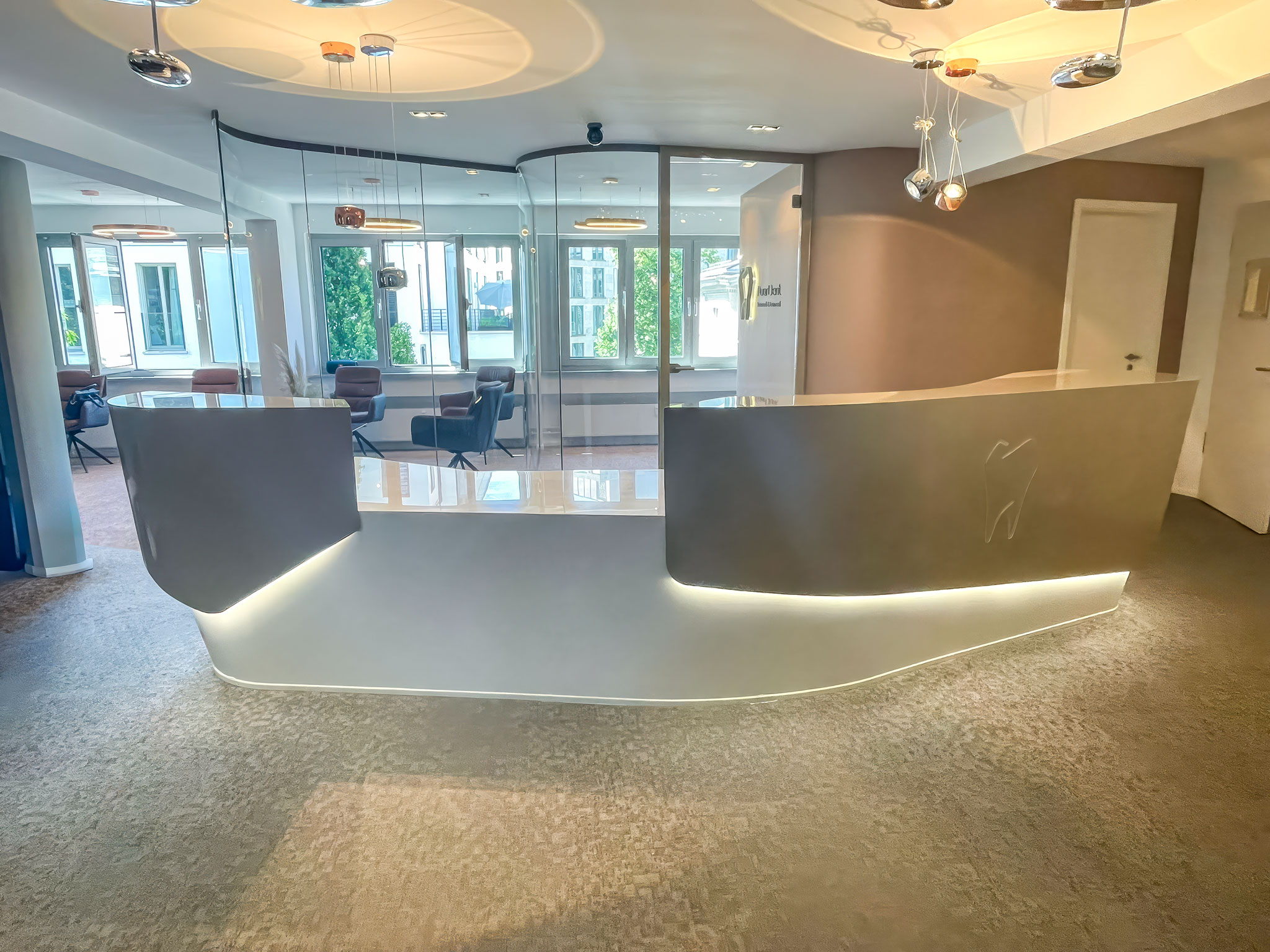 Design und Atmosphäre: Der Empfangs- und Wartebereich wurde bewusst mit hellen Lichtkonzepten und modernen, einladenden Elementen gestaltet, um Stress abzubauen und den Patienten eine angenehme und beruhigende Atmosphäre zu bieten.